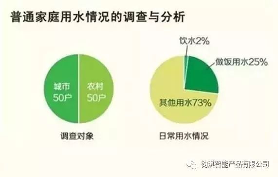 通過對100個(gè)家庭(城市:50個(gè),農(nóng)村:50個(gè))的日常用水情況做了一個(gè)詳細(xì)的調(diào)查,結(jié)果表明:一個(gè)家庭的總用水中,飲水只占2%,做飯相關(guān)用水占25%,其他生活用水占73%。